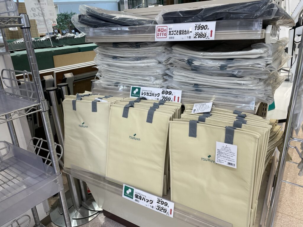 ツルヤオリジナルのレジカゴバッグと保冷バッグを発見!野菜コーナー寄りのレジ前にありました。店内には保冷用氷もあるので、名産品の野沢菜漬物や牛乳寒天なども安心してお土産に買えます♪